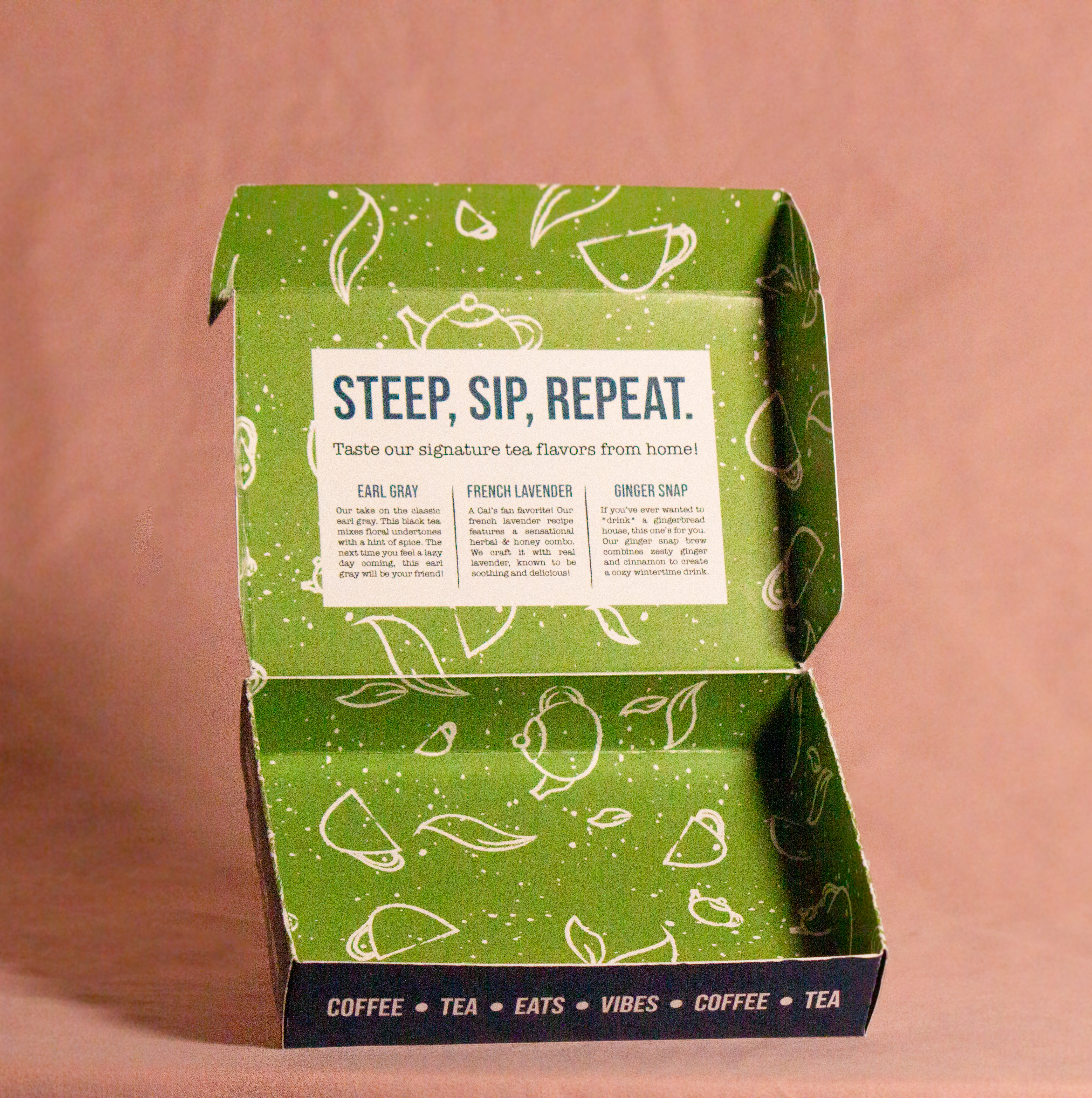I designed this conceptual product packaging for Cai’s Cafe. I visualized a tea box for purchase and incorporated Cai’s cozy brand identity.