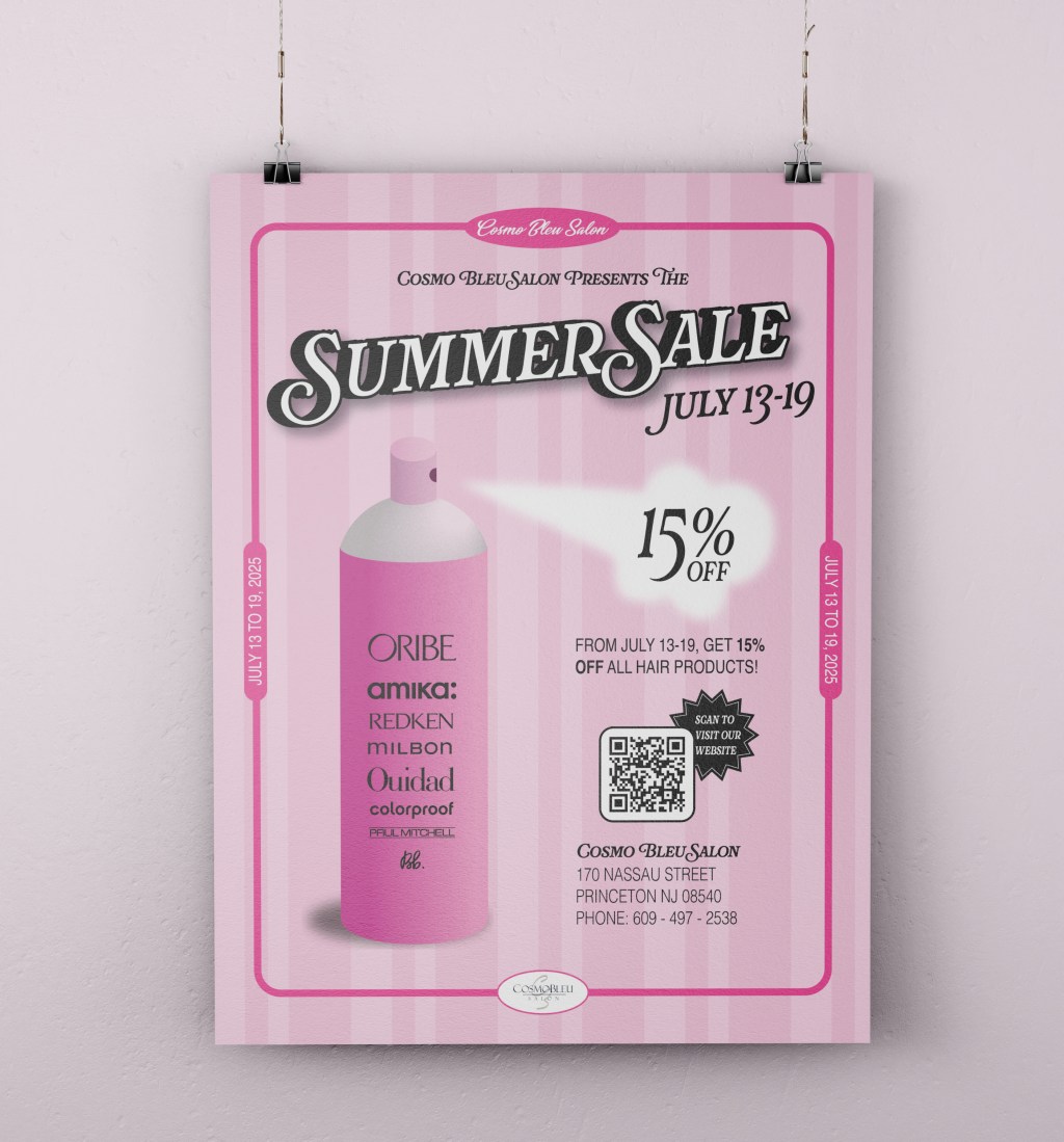 I designed this ad series for Cosmo Bleu Salon’s Summer Sale of 2025! This series included a flyer, Instagram post, reminder card, and website banner countdown.